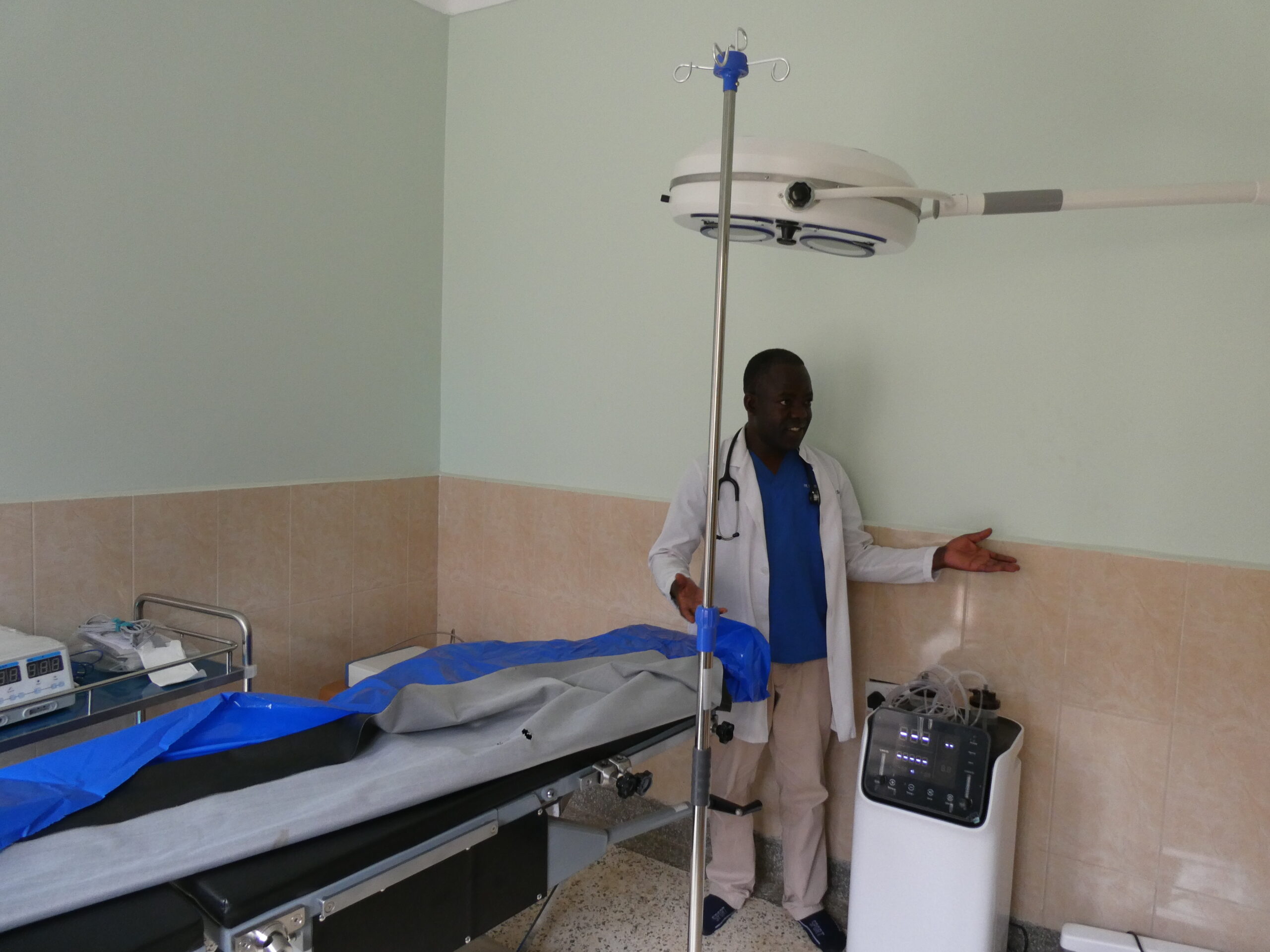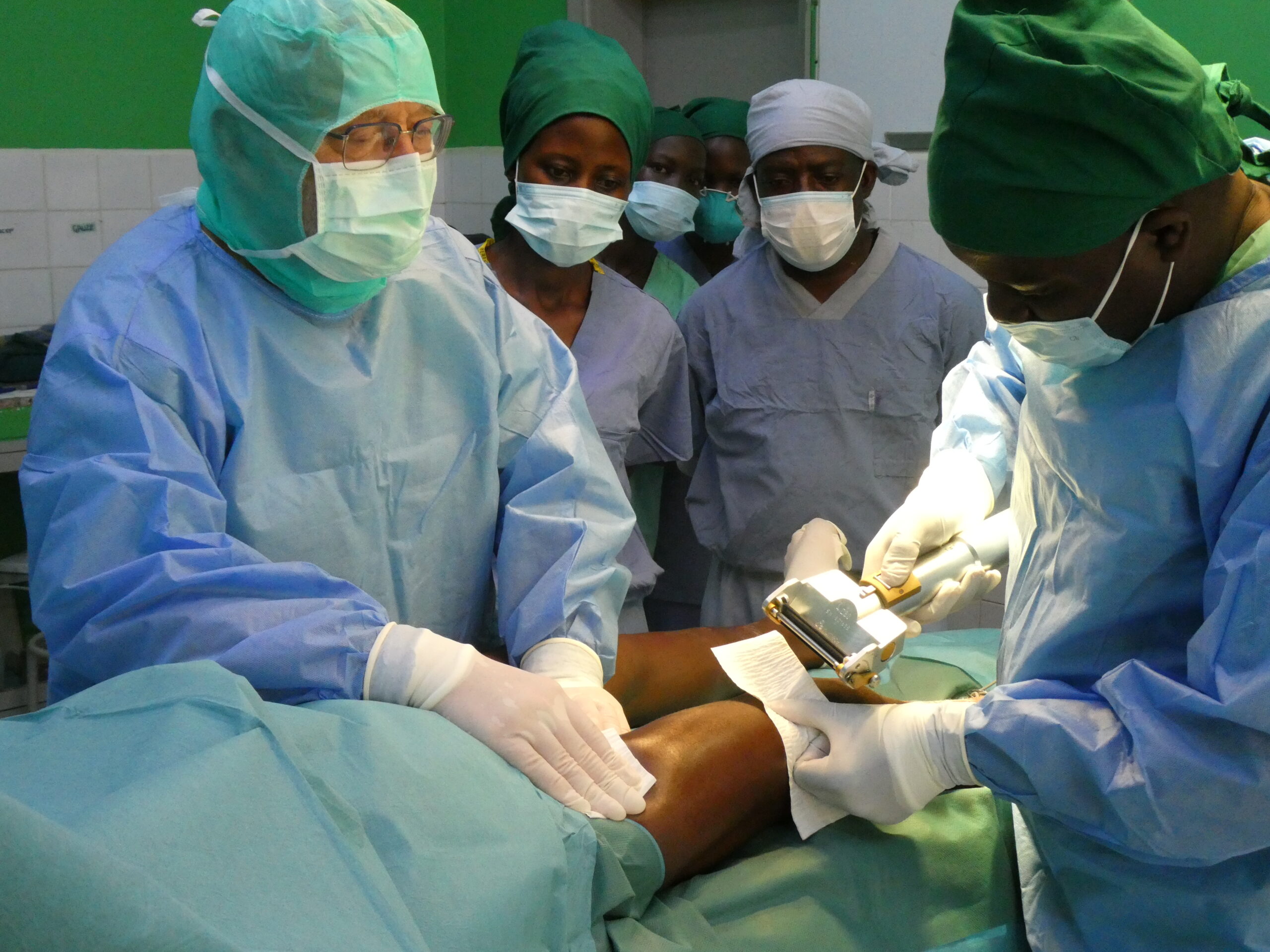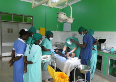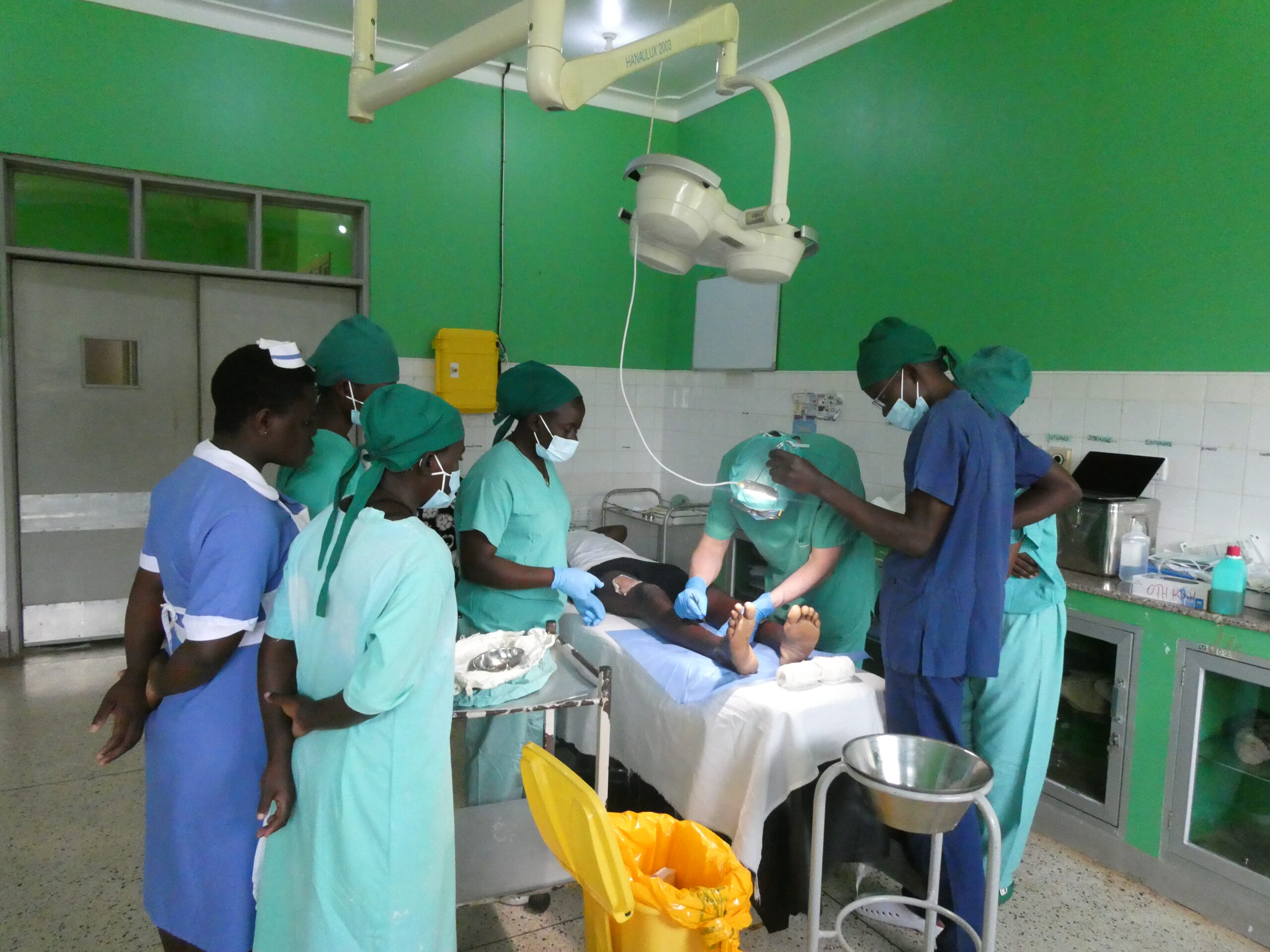 Im OP waren Sr. Agnes, die aus gesundheitlichen Gründen sonst an anderer Stelle im Hospital arbeitet, sowie die Medical Officers Deborah und Bonny wertvolle Hilfen. An 9 OP-Tagen konnten wir so bei 39 Patienten 51 Operationen durchführen. Claudia und Jule (die ihren ersten Einsatz erlebte) arbeiteten bei jeder Operation eine örtliche Kollegin ein, Pavol und ich als Operateure standen nie ohne örtliche ärztliche Assistenz am Tisch bzw. assistierten unsererseits den ugandischen Kollegen. Von großem Wert sind die von uns dem Krankenhaus geschenkten Einrichtungsgegenstände, unter anderem die Anästhesiemaschinen, die unser Anästhesist Hans-Jürgen wartet, sowie das Dermatom (Entnahmegerät dünner Hautschichten zur Deckung von z.B. Verbrennungswunden). Den Tag schloss jeweils die gemeinsame Visite unserer Patienten auf der renovierten Chirurgischen Station ab.