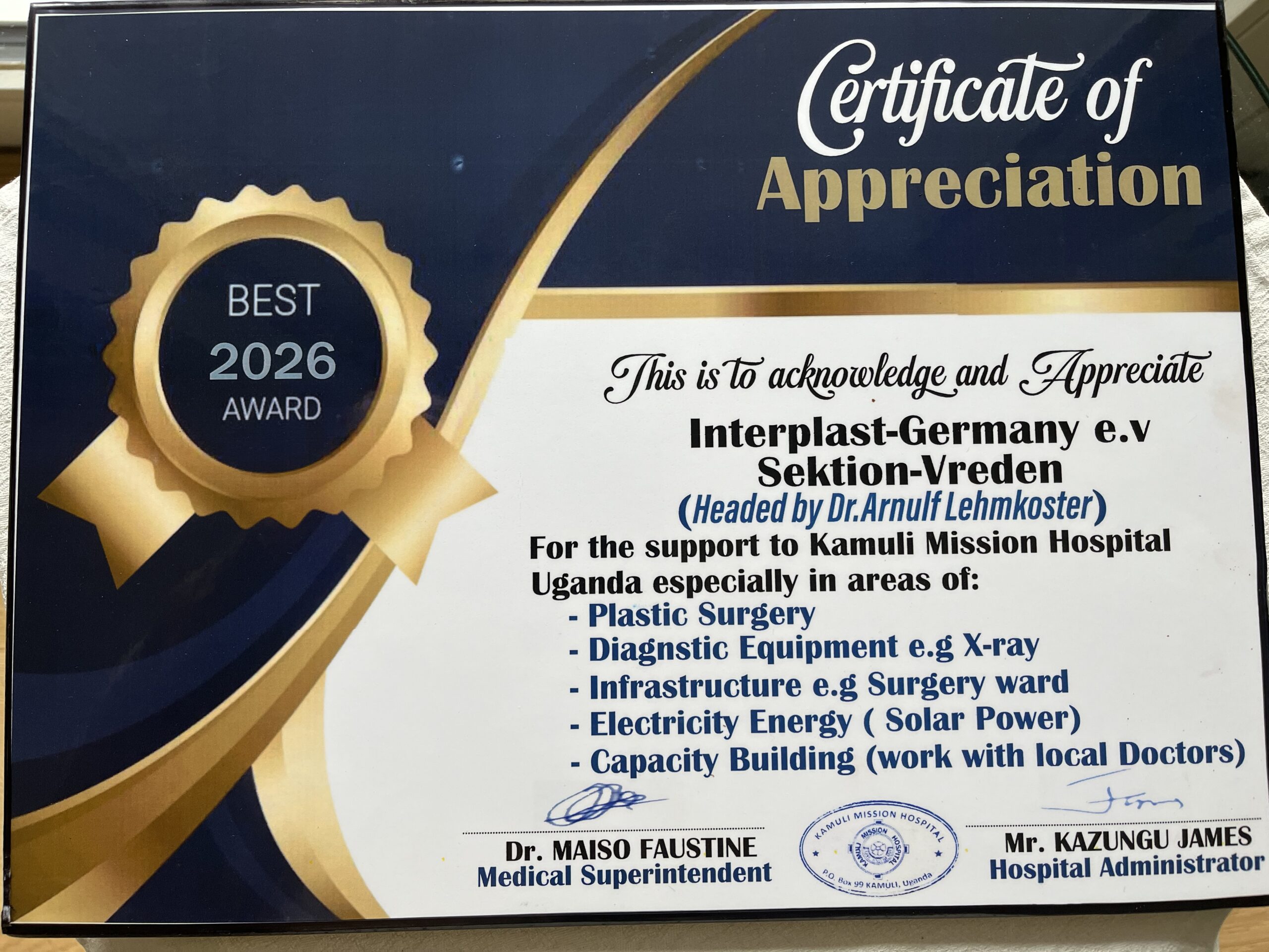 Im Gästehaus versorgte uns in bewährter Weise unsere Köchin Goretti. Dr. Faustine bedankte sich mit einer Auszeichnung der Klinik für unsere Investitionen über die Jahre und unser Engagement.