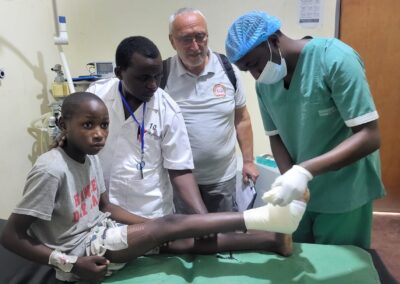 Das hatten wir noch nicht erlebt, dass der Ärztliche Direktor selbst jeden Tag mit uns arbeitete. Er übernahm die Vorsichtung der wieder in Scharen angereisten Patienten, sodass wir rasch die OP-Pläne für die nächsten 10 OP-Tage geschrieben hatten. Vor allem konnten wir die operieren, die auch nach Ansicht unserer Partner vor Ort Vorrang hatten: chronische Wunden, Kontrakturen nach Verbrennungen, große Weichteiltumoren der Körperoberfläche und vor allem, ca. 20, chronische Knocheneiterungen, meist seit Kindheit bestehend, teilweise vielfach voroperiert. Auch am Samstag und Sonntag fand je eine große Operation statt.
