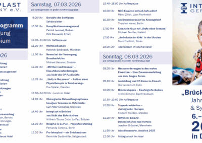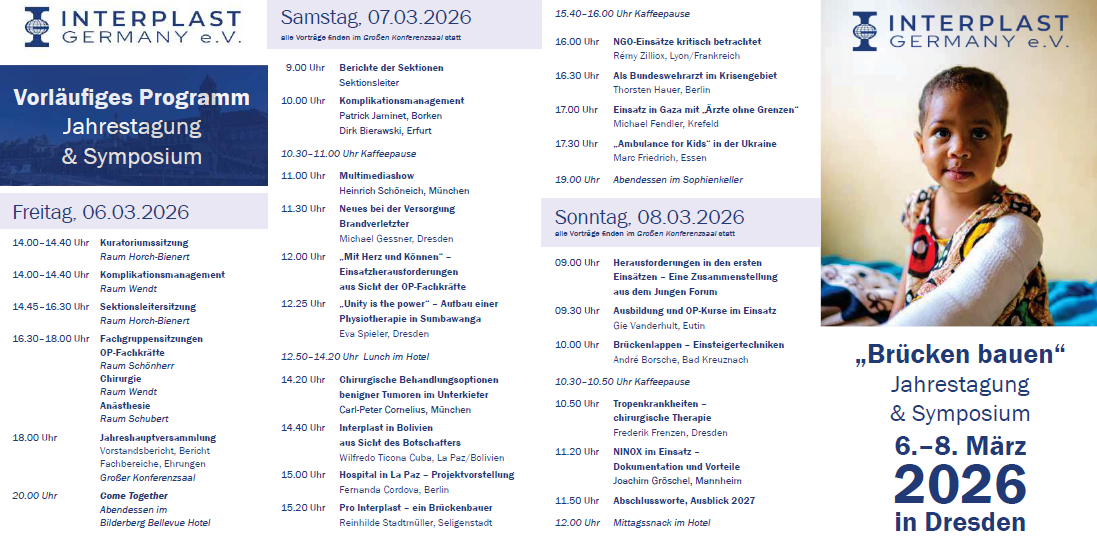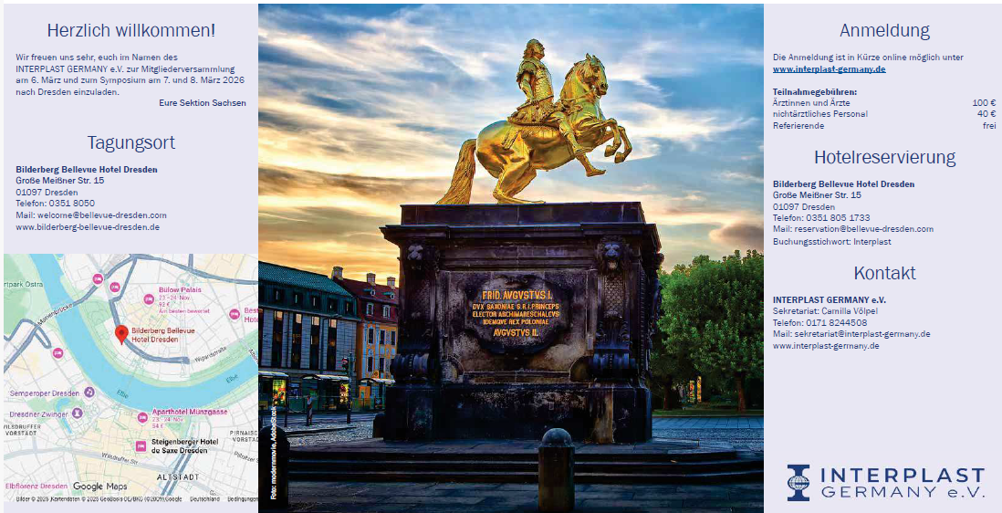 Kostenbeitrag: Während die Teilnahme an der Jahreshauptversammlung des Vereins kostenfrei ist, wird erstmals ein Kostenbeitrag für das Symposium und die Abendveranstaltung erhoben. Ärztinnen und Ärzte (100€), OP-Fachkräfte und Nichtärztliche Teilnehmende (40€), Referentinnen und Referenten des Symposiums (0€) Überweisung erbeten auf das Interplast-Kto. IBAN: DE42 3702 0500 0001 4406 02 BIC: BFSWDE33